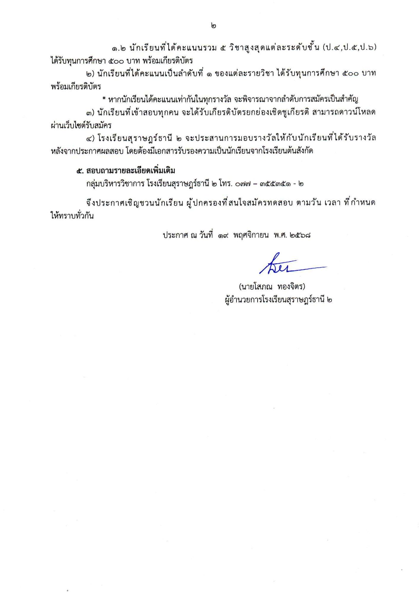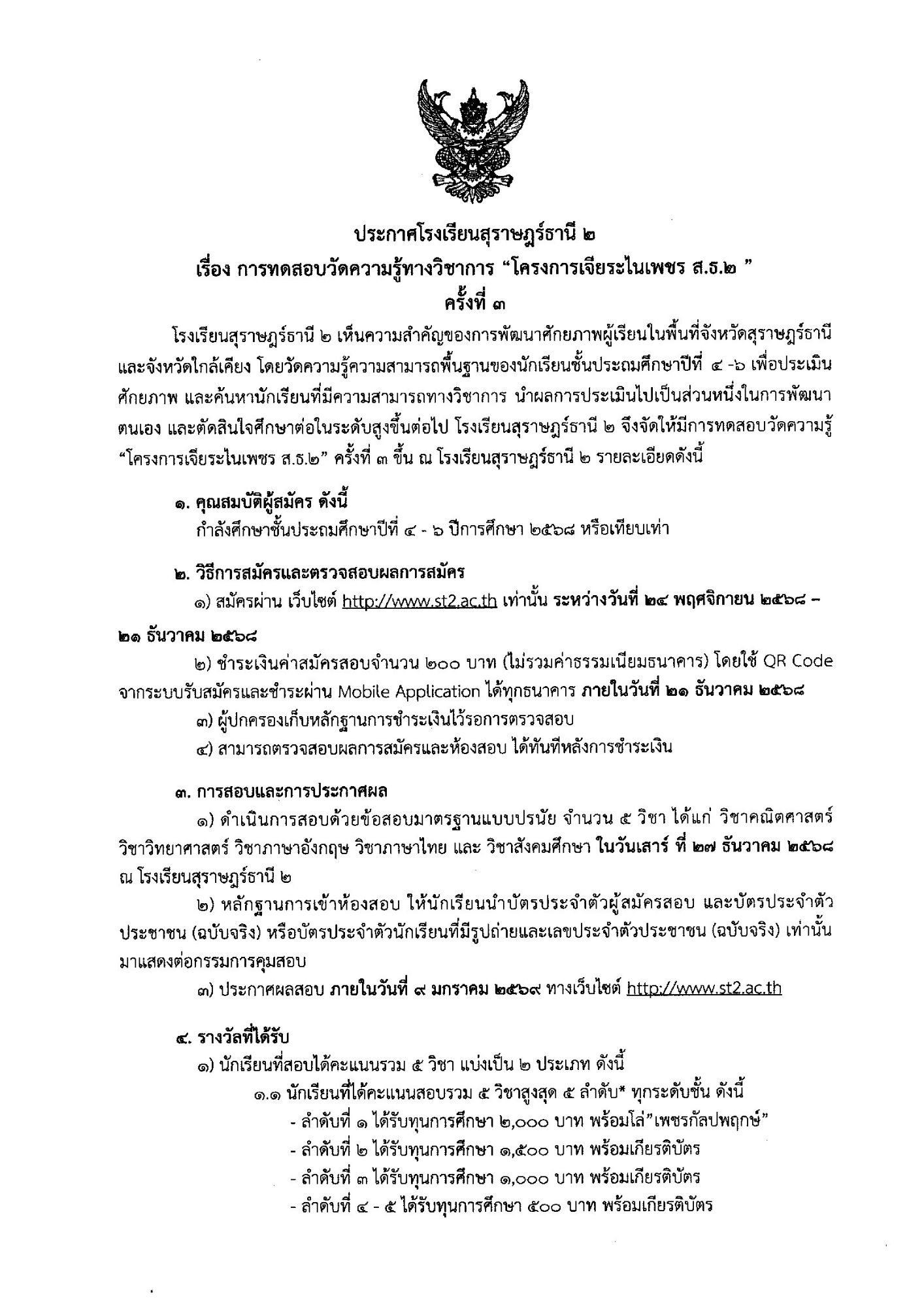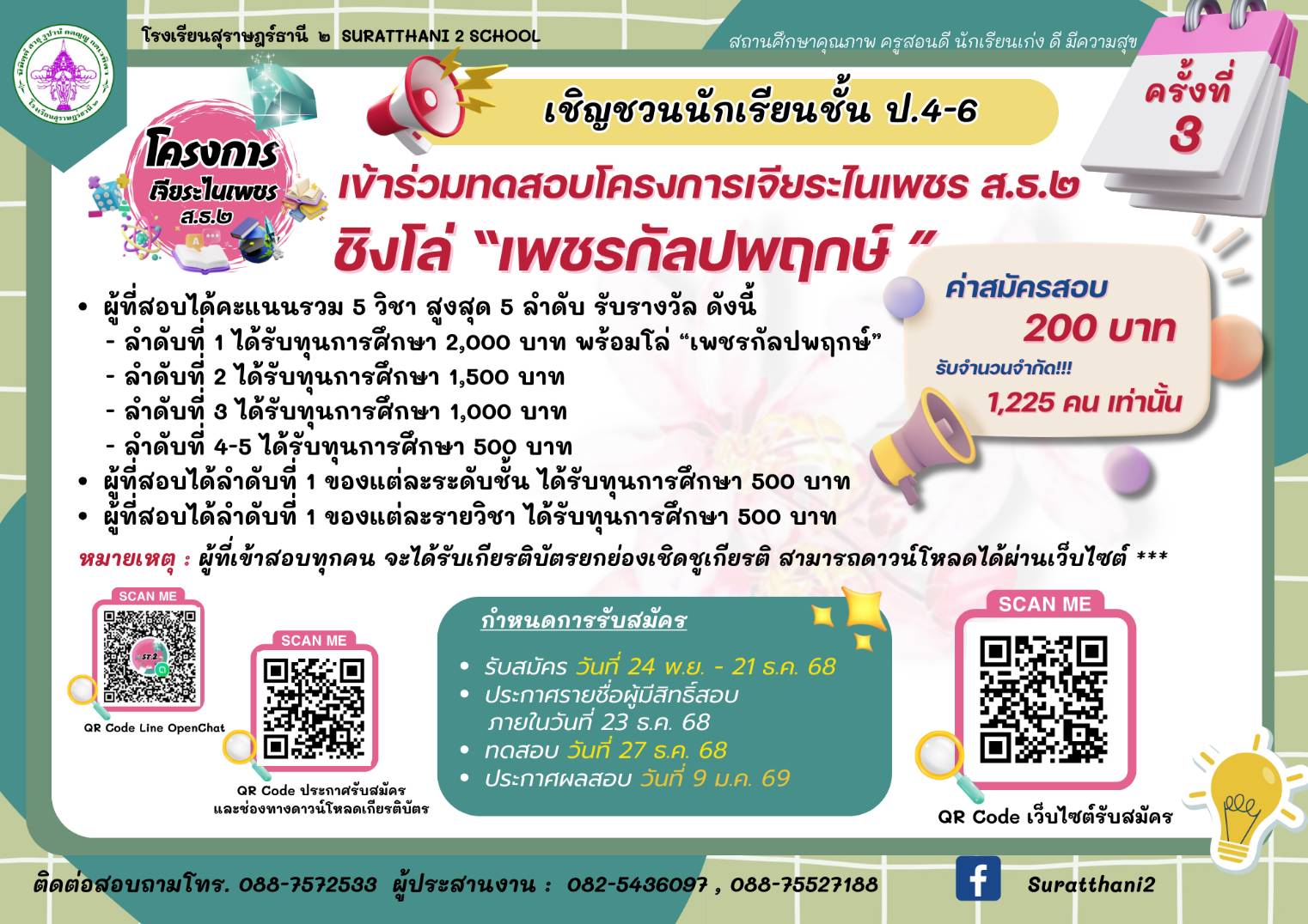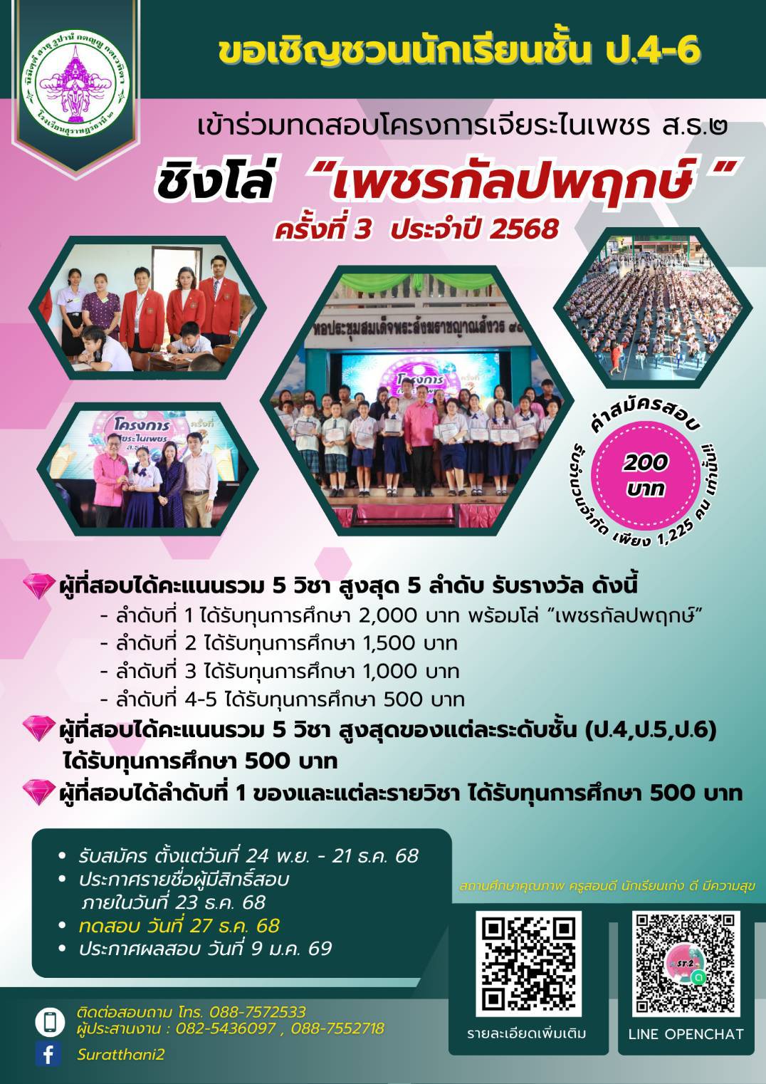 🔔 โรงเรียนสุราษฎร์ธานี ๒ เปิดรับสมัครสอบวัดความรู้  ชิงทุนการศึกษาพร้อมรับโล่ “เพชรกัลปพฤกษ์” สำหรับนักเรียน ป.4 - ป.6 โครงการเจียระไนเพชร ส.ธ.๒ ครั้งที่ 3  ประจำปี 2568